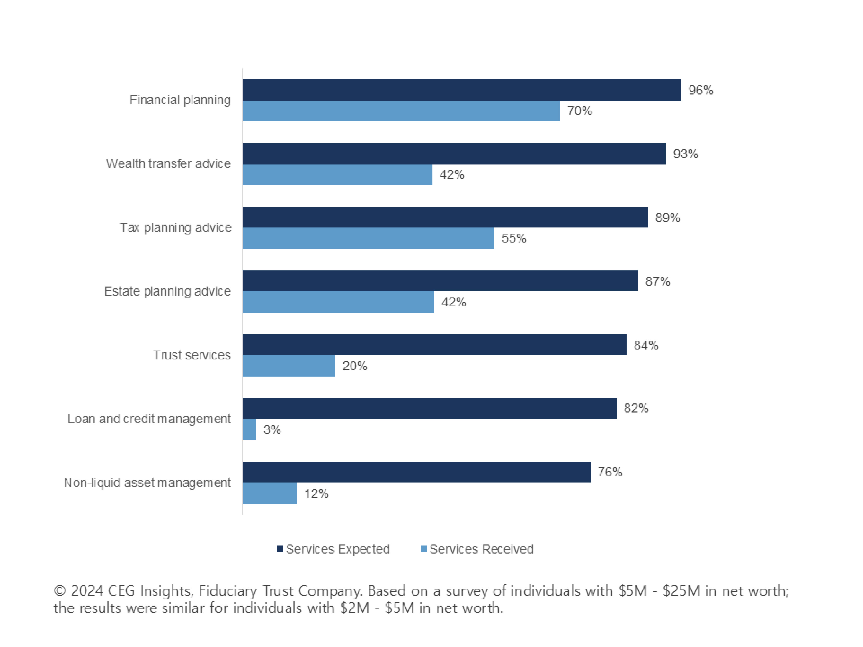 According to CEG Insights, while wealth managers typically provide two of the key services that high-net-worth families seek (investment management and financial planning), few are providing the broader range of services they desire, as described in the chart below:
