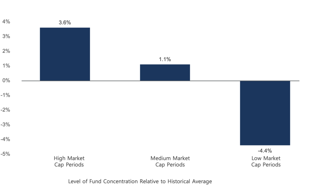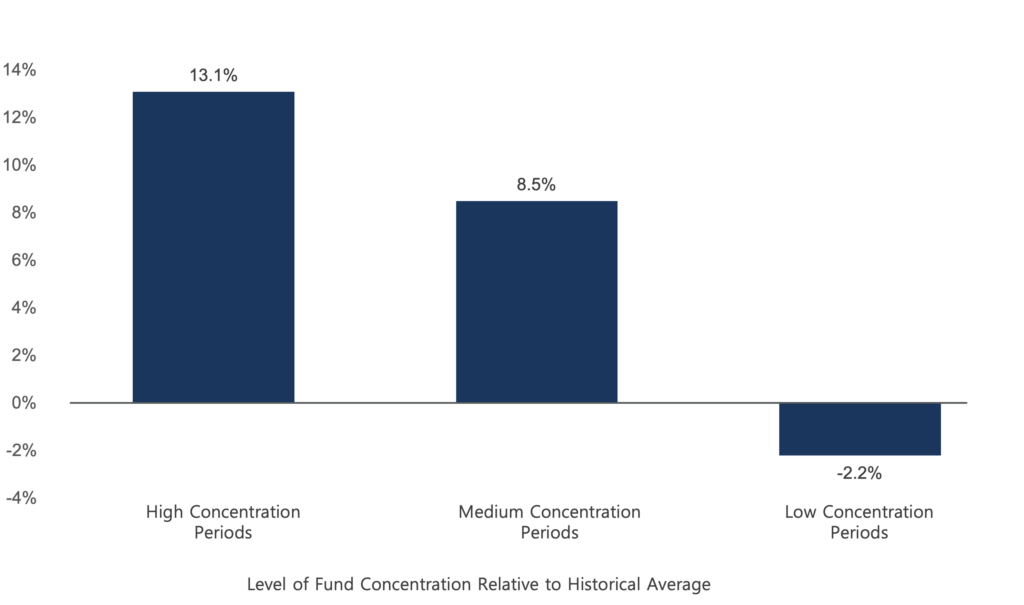 Source: Bloomberg, Fiduciary Trust Company. International Developed Market Total returns based on the MSCI EAFE index. Periods of fund concentration are categorized (High / Medium / Low) based on the top, middle and bottom third periods of concentration from 2015-2024 and includes international funds with under 150 holdings and evaluated quarterly.